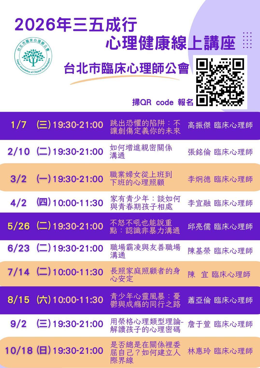 [台北市臨床心理師公會] 2026年度三五成行心理健康線上講座